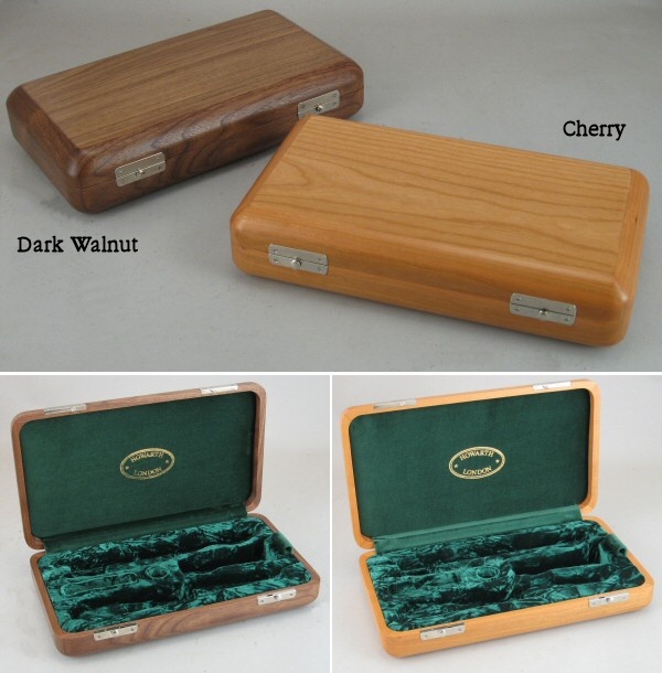 Our new and very special wooden oboe case. These cases are made specially for us in England from Cherry or Dark Walnut, then finish-lined in our case-making department in green velvet. With a little bit of 'Je ne sais quoi...!'