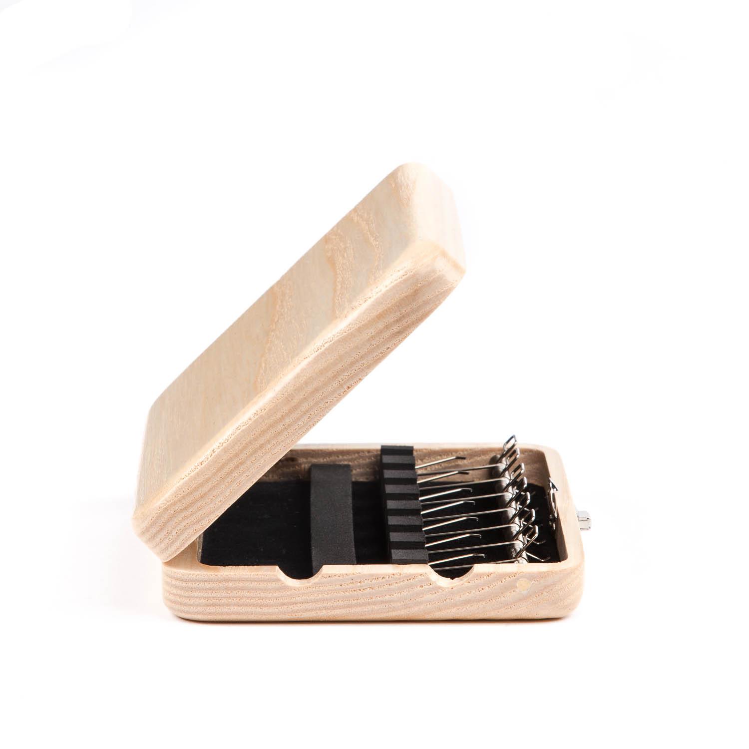 The EM Cor Anglais reed case is available in 3 different finishes; Black, Beech or Mahogany. The reeds are held in place on an individual spring to protect them.
