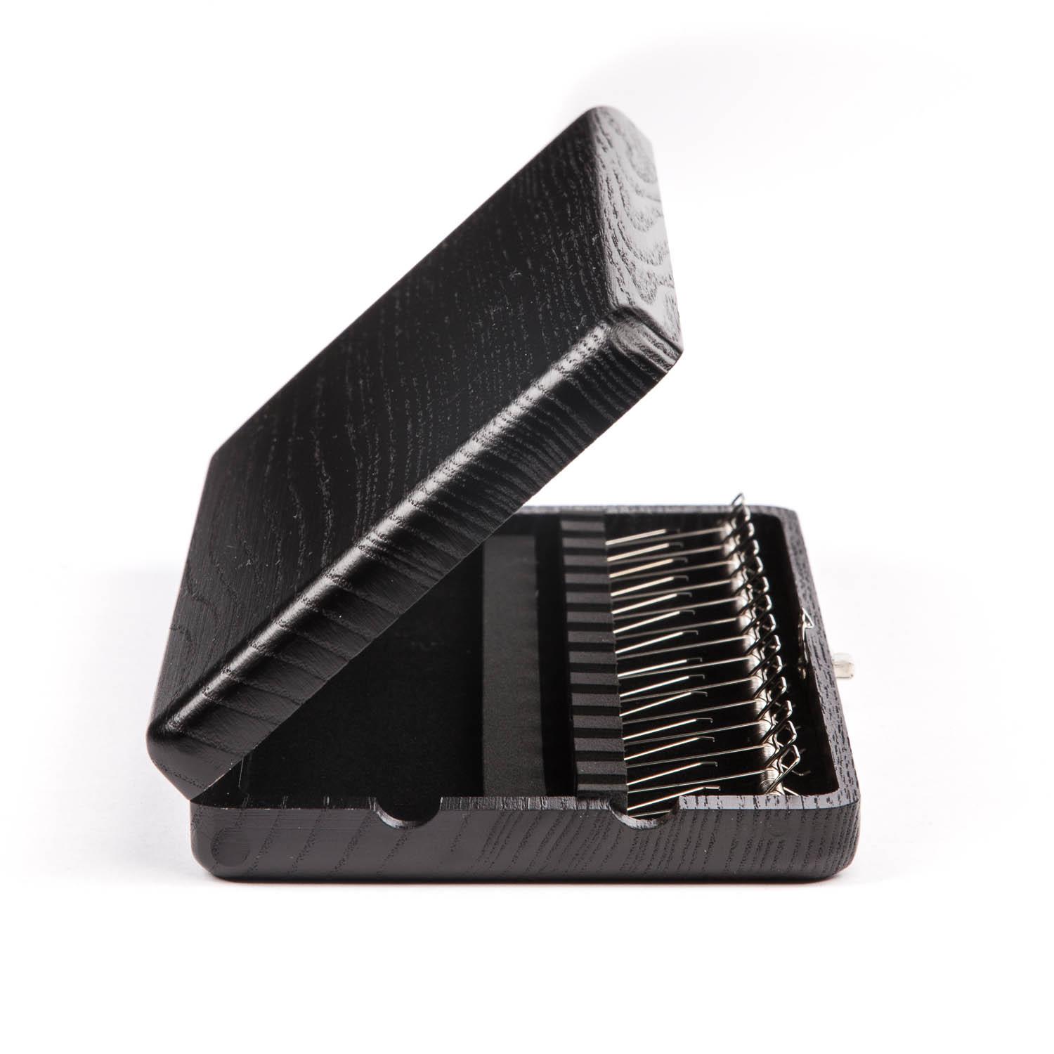 The EM Cor Anglais reed case is available in 3 different finishes; Black, Beech or Mahogany. The reeds are held in place on an individual spring to protect them.
