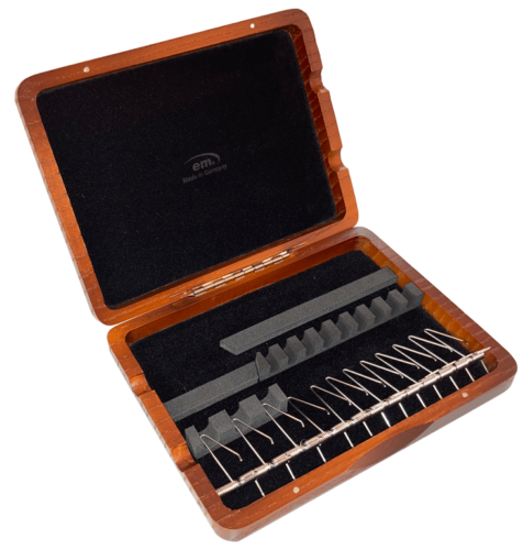 The EM Oboe and Cor Anglais reed case is available Black, Beech or Mahogany. The reeds are held in place on an individual spring to protect them.