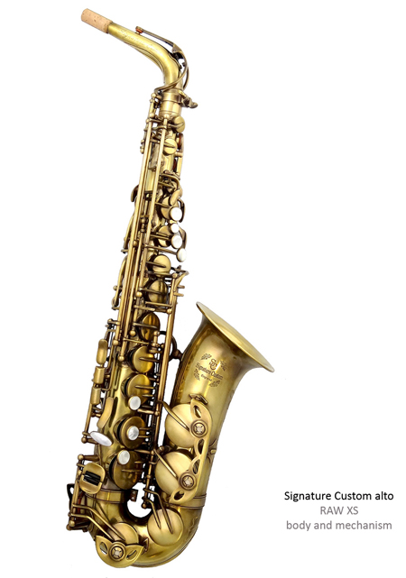 The new 'Raw' and 'RAW" XS* Signature Custom saxophone have been developed following more than 12 months of testing, discussion and research with sax players around the world who wanted a genuine vintage sound along with an aged look to their instrument. Unlike many other Companies who simply apply a coloured finish to the instrument to give it the appearance of being old, we have simply taken the saxophone in it's raw manufactured condition and added the mechanism. So when we say the instrument is RAW...it really is!!