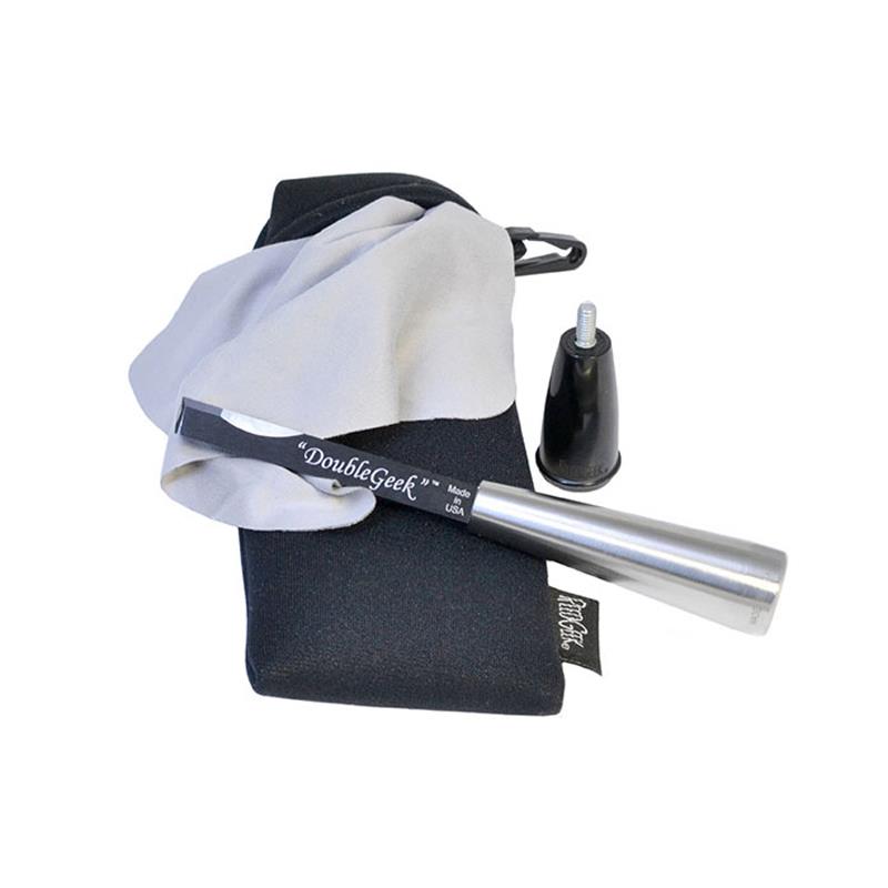 'In addition to implementing the wildly successful Universal tool’s features, the GEN2 set is engineered with two oversized bevels allowing double reed players to fine tune reed spines, corners & tips with efficiency and ease (12 unique cutting surfaces in all). Like the G4, the DoubleGeek GEN2 is available in our Black Diamond wear finish providing refinement of the cut on both natural cane and synthetic reeds. The GEN2 set is encased in a deluxe, proprietary neoprene bag with a sewn-in microfiber cleaning cloth, a water tight case. For added leverage and familiarity in the hand the set includes a 3 inch stainless steel handle and a small black palm handle, both threaded for easy attachment to the DoubleGeek.'