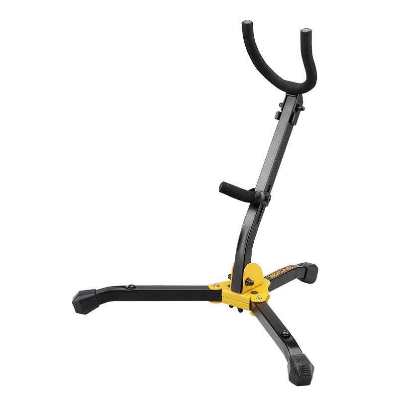 The HERCULES Saxophone Stand DS530BB has a folding yoke, an adjustable backrest, and locking pins that are secure and stable for use with Tenor or Alto Saxophones
