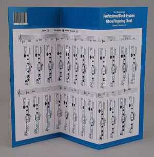 A fingering chart to show the notes on an Oboe up to G# and A in the third octave. This dual system chart is for a conservatoire Oboe with an added thumbplate. A laminated sheet that can fold to fit into your instrument case or when flat, will easily balance on a music stand. All fingering diagrams have been derived from photographs of the Oboe keys and holes, so that the diagrams look as natural as possible. There are no confusing numbers and, in addition, practical alternative fingerings are shown.